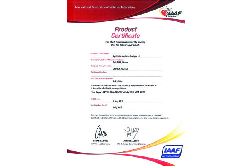 CONICA的跑道地材已獲得多項國際田聯產品證書。 除此之外,超過100個採用CONICA系統的體育場已獲得世界田徑聯會1級或2級認證。