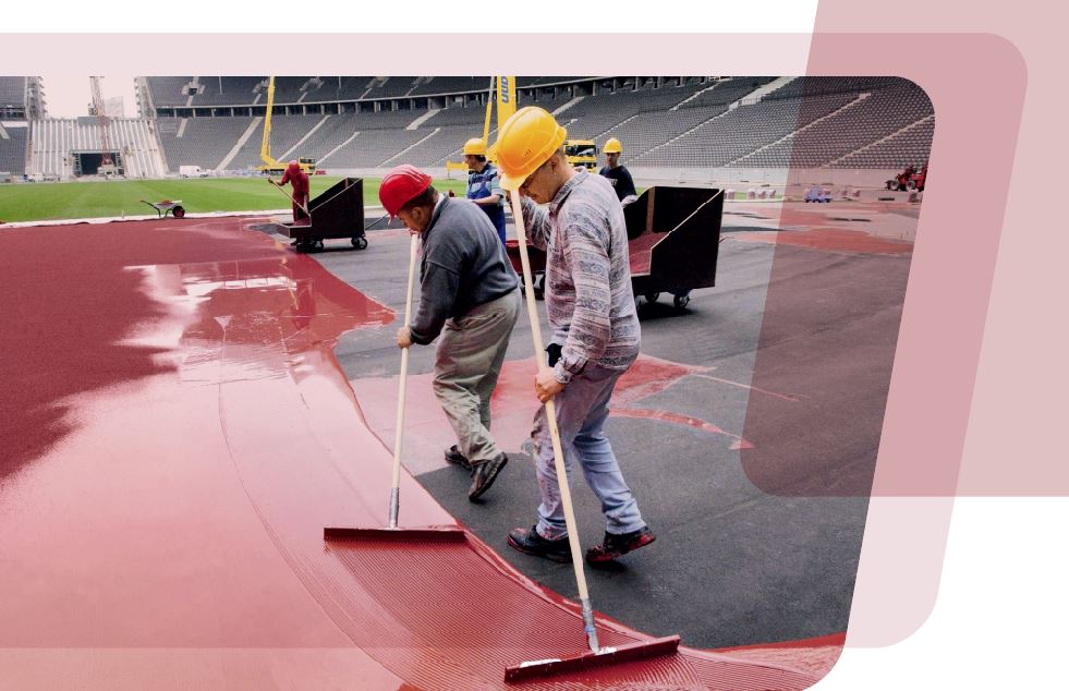 世界田徑總會(IAAF)認證的雙層可滲透噴塗系統。 由再生顆粒製成的基礎層,與優質CONICA PUR粘合劑混合。 頂層由聚氨酯噴塗層和優質CONIPUR EPDM顆粒製成。